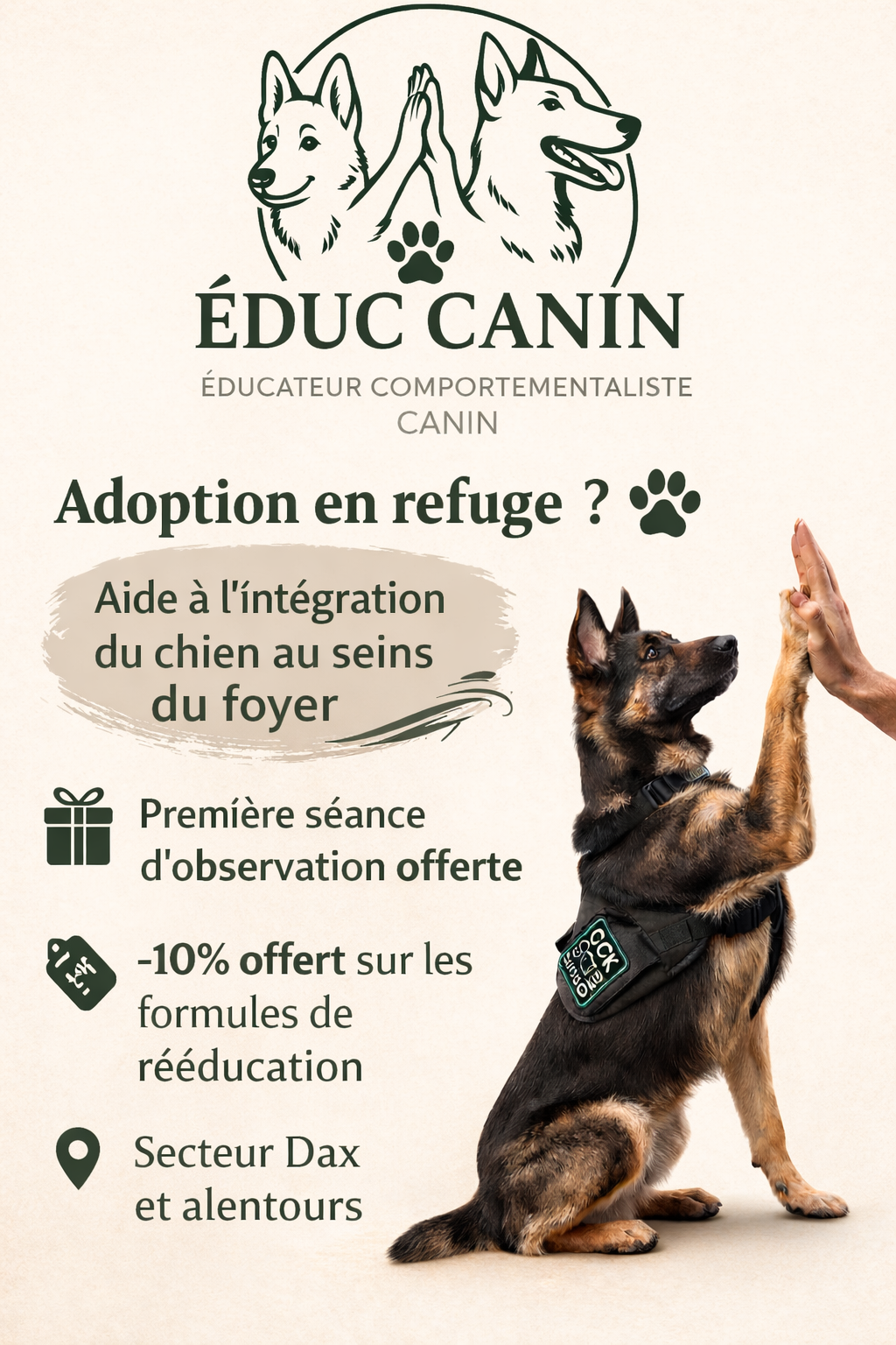 Après l’adoption, j’interviens pour faciliter l’arrivée du chien à la maison : mise en place des règles, compréhension du chien et premiers apprentissages. L’objectif est simple : installer rapidement une relation saine et éviter les problèmes comportementaux.